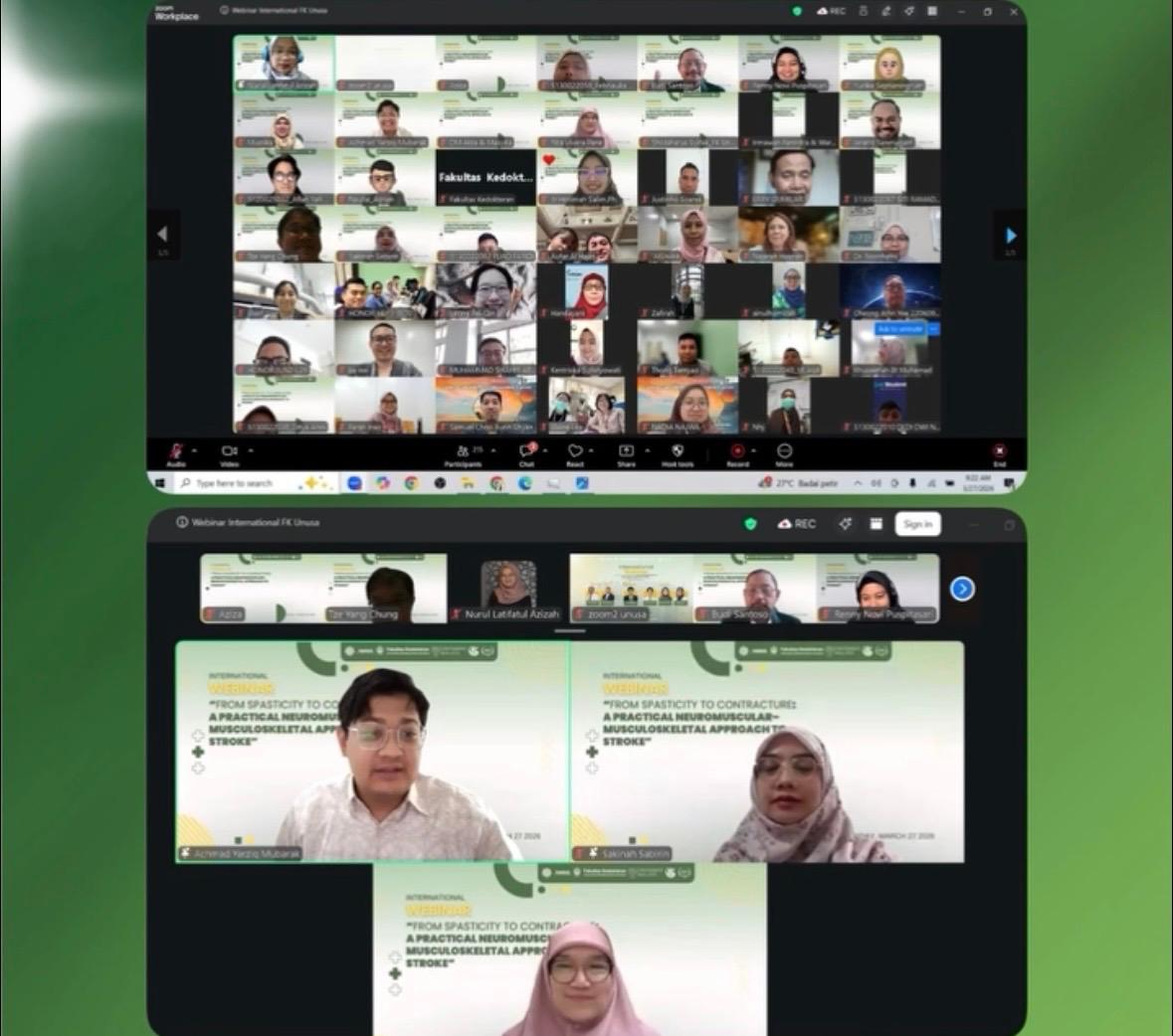 Surabaya – Fakultas Kedokteran Universitas Nahdlatul Ulama Surabaya (FK UNUSA) berkolaborasi dengan Universiti Malaya menggelar International Webinar bertajuk “From Spasticity to Contracture: A Practical Neuromuscular–Musculoskeletal Approach to Stroke”, Jumat (27/3). Kegiatan ini menghadirkan para pakar rehabilitasi medik untuk membahas pendekatan komprehensif dalam penanganan pasien stroke.